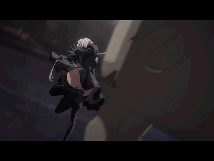 紧接着2B小姐姐的落地英姿,音效和动作配合完美,一气呵成,和原作相比,可谓百分之九十九一致,唯一一点不同,在于“万众瞩目“的“绝对领域”,在动画里不仅没有被刻意删减,甚至好像还更突出了一点点,也可能是考虑到阴影效果,改成了稍微偏灰的颜色,不是原作中惹眼的一抹纯白。