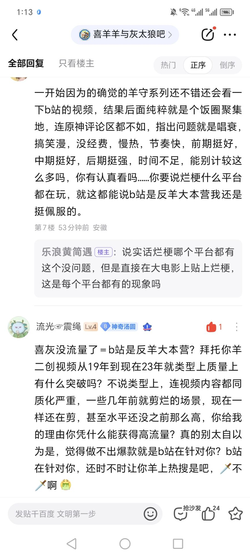 某人发帖说b站是反羊大本营,我觉得这两网友说的没有一点问题,然后瞬间评论就不见了,肯定是被吧务组拉黑删除。
