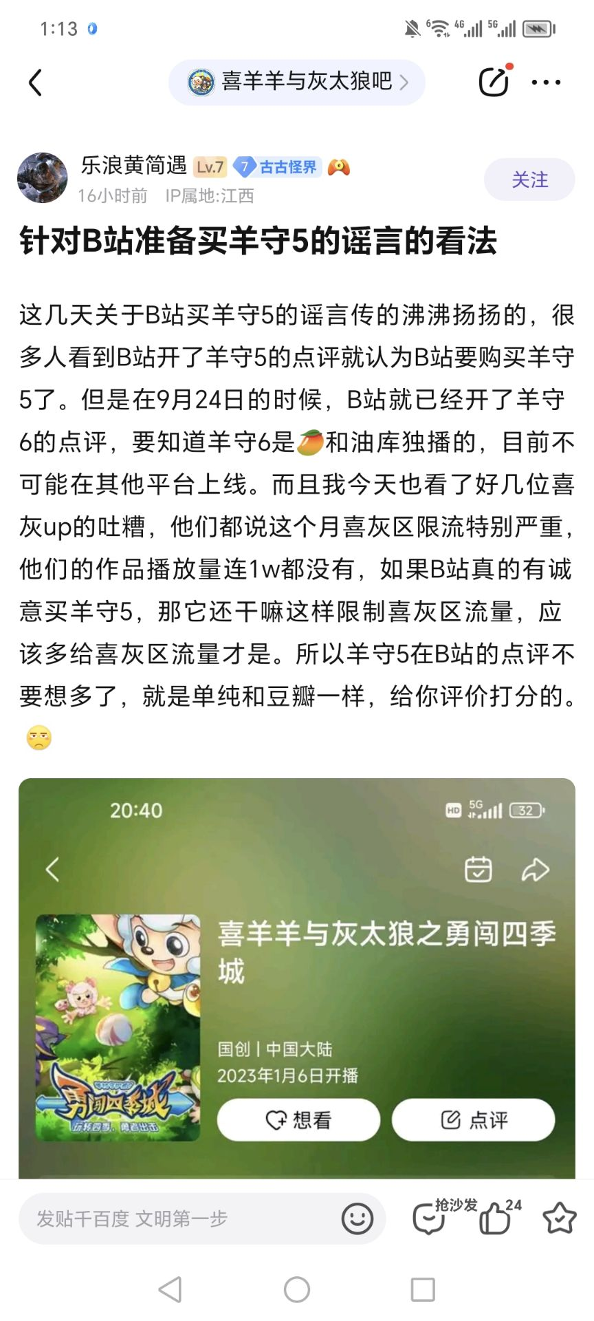 然后就是人物刻画,喜沸懒刻画的还行,然后美暖就是工具人➕背景板,灰又是发刀子的工具人,把黑太狼拿出来鞭尸,真的差不多得了,让他安静的去世不行吗?还弄个模棱两可的结局,所以跨救就是来搞笑的?因为贴吧喜粉多,所以这一季就被贴吧各种吹,大姐,其他羊是没有粉丝吗?美粉暖粉会觉得这好看?还不如看羊守四呢,真服了贴吧那群魔怔种了,只允许存在自己觉得好的评论,不符合自己的就禁言拉黑,真的有够恶心的,给别人扣上奇救吹的帽子,利用自己的权利滥用职权,胡乱禁言别人,还大言不惭的说什么不欢迎你,以为自己是皇帝呢?一个网络世界差不多得了哦。