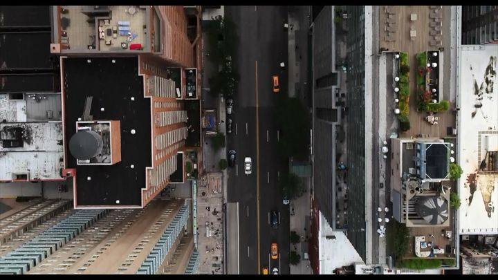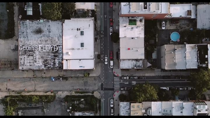两个十字路口,街道两旁 ,一边是高楼耸立,一边是黑人和底层贫民区……看屋顶上的涂鸦,映射乔治,弗洛伊德事件……