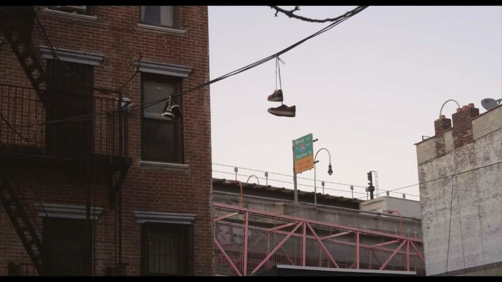 电线上挂着的球鞋……这是美国黑人文化的符号,和篮球,RAP,涂鸦……一样,都归类于黑人的街头文化!
