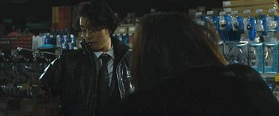 而在相当之关键的内野圣阳“武士刀”大战颜正国“独臂刀”这场戏里,三池崇史显然花费了足够的心思来仔细设计。影片在这里忽然一改黑帮枪火大混战的视觉风格,镜头变为只聚焦于当下的两个人物。而空间也被严格限制到两个货架之间,二人主动扔掉热兵器,转而拿起自身文化身份象征的武器进行公正对决;且在动作编排上也发生转变,由之前大量眼花缭乱的血腥乱斗,变为了一招一式、有来有回的双雄对决。