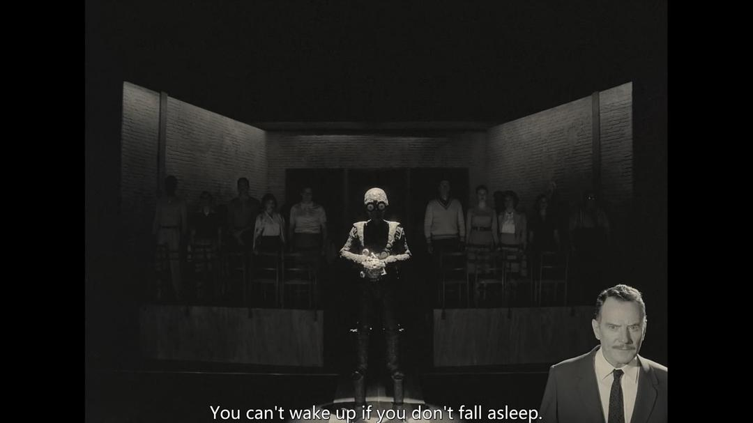 再次回到Saltzburg Keitel的教室。“Jones”起身喊道,“You can’t wake up if you don’t fall asleep,”所有演员也面对镜头开始喊了起来,第一层的外星人也以人的形态出现了。这是打破第二层朝向第三层的对话。而通过这一层喊话,结合之前的种种线索,我们又开启了一个“夹层”——