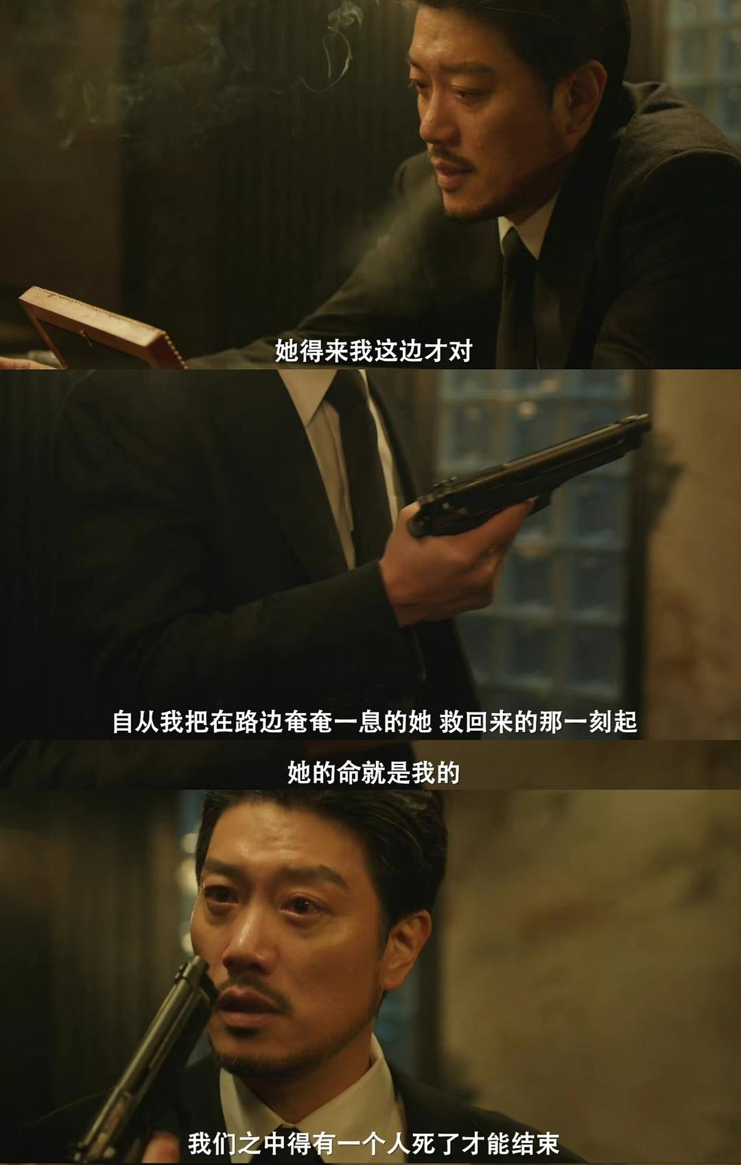 崔老大和她举枪对峙,然后把枪放下。镜头特写了崔老大的黑枪,很有深味地低头看了看自己黑色枪的子弹匣。他是知道智友的枪没有子弹的。