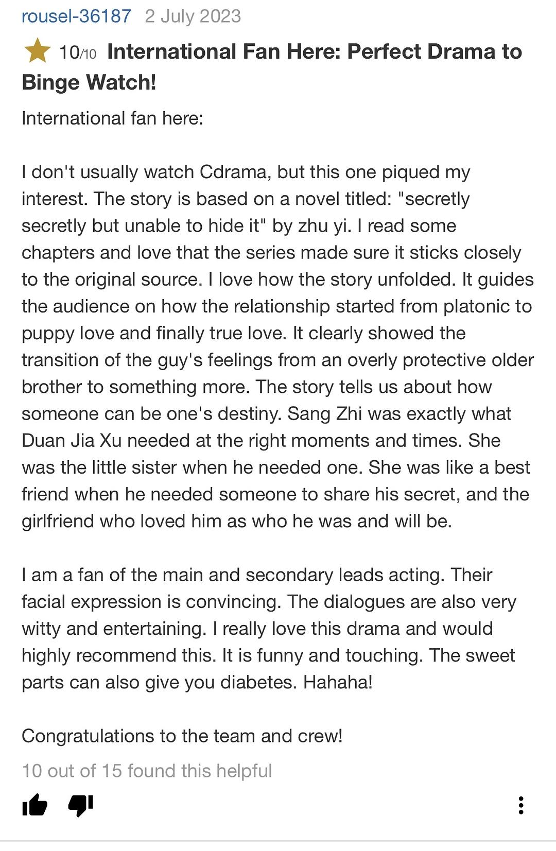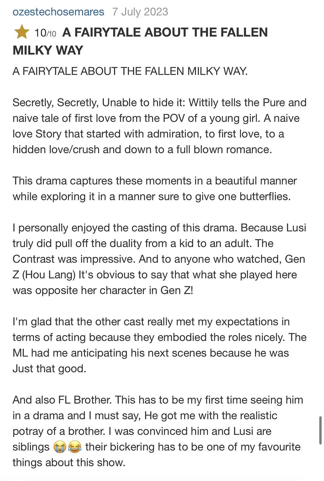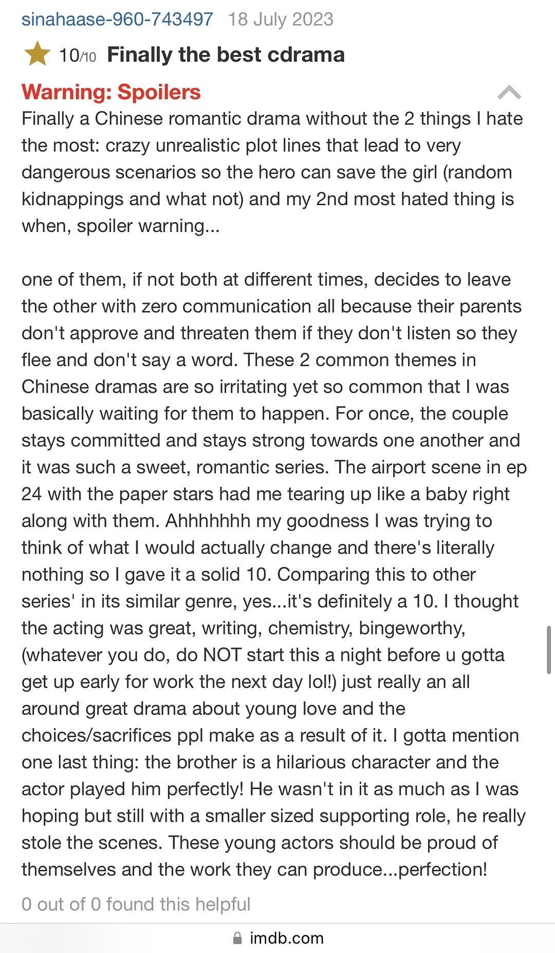 其中一个人,如果不是两个人在不同的时间,因为受到父母反对和威胁,毫无沟通地决定离开对方,于是他们悄悄逃走,一句话也不沟通。这两个情节在中国电视剧中太常见了,以至于让人感到十分烦恼,几乎可以预料到它们会发生。但是这一次,这对情侣保持了承诺,彼此坚定,创造了一部充满甜蜜浪漫的剧集。第24集里机场的场景,还有用纸星装饰的那一幕,让我像个婴儿一样跟着他们一起感动得热泪盈眶。哎呀,真是太感人了。当我努力思考是否有什么可以改进的地方时,实际上真的找不到任何缺点,所以我给了它满分10分。拿它与同类剧集相比,毫不夸张地说...绝对值得满分10分。我认为演技、剧本、演员之间的默契,以及它让人欲罢不能的程度都很棒。(不管怎么样,千万不要在前一天晚上开启它,因为你可能会因为第二天一早上班而熬夜看剧哈哈!)总之,这是一部非常优秀的关于年轻爱情以及由此带来的选择和牺牲的剧作。最后我要特别提一下:那个兄弟角色实在太搞笑了,演员把他演绎得非常到位!虽然他出场时间没有我期望的那么多,但在一个较小的配角中,他真的抢尽了风头。这些年轻演员应该为自己的表现以及这部出色的作品感到骄傲...简直完美!