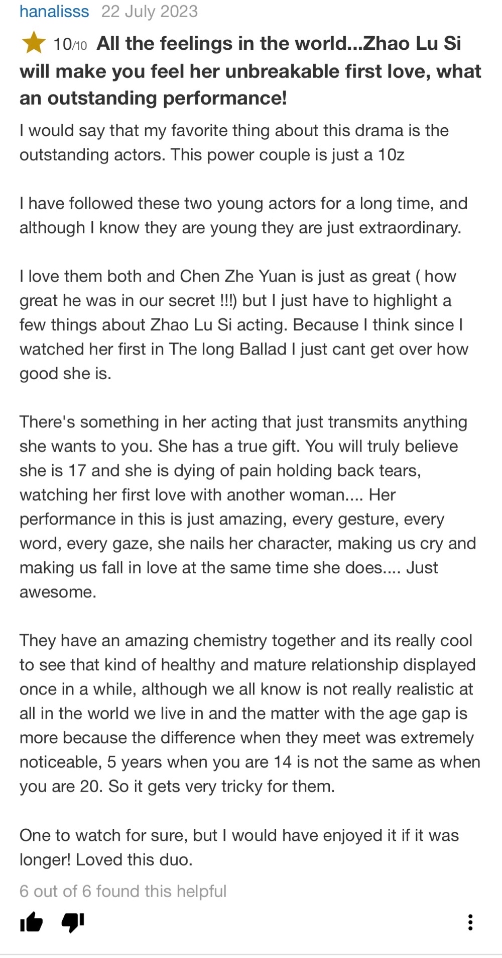 赵露思饰演的桑稚是一个体贴入微的角色。她不仅从未放弃过她的爱,而且她对他付出了百分之百的努力,从未感到不安或过于确信“是他就是我的唯一”。赵露思再次给我留下了深刻的印象!她完美地诠释了角色,即使扮演17岁的角色也相当令人信服,尽管在拍摄时已经23岁。她还演唱了两首让每个场景氛围更加活跃的歌曲。她真的令人印象深刻。