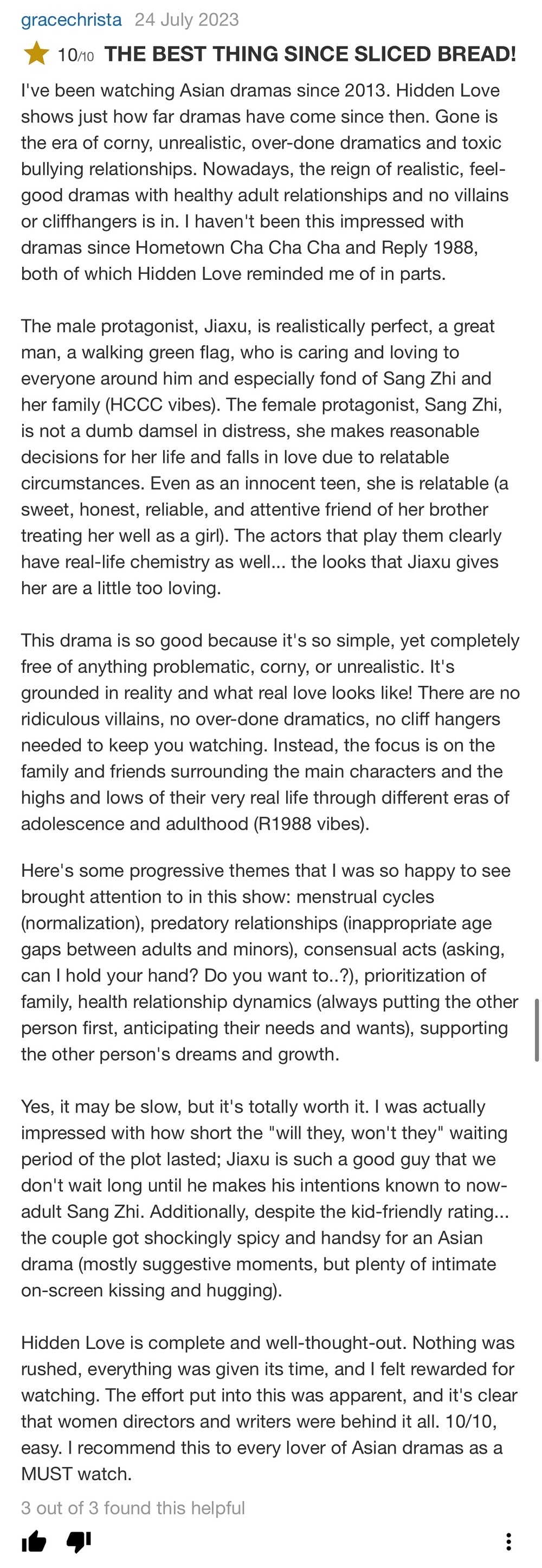 这真是自面包切片机问世以来最棒的事物!我自2013年开始追看亚洲剧,而《偷偷藏不住》彰显了剧集自那时以来的巨大进步。那种过于俗套、不真实、过度戏剧化和充斥有毒欺凌关系的时代已经过去了。如今,真实主义、温暖感人的剧集以及健康成年关系的时代来临,不再需要反派角色或悬念的搭配。自《海岸村恰恰恰》和《请回答1988》以来,我再次感受到剧集的震撼,而《偷偷藏不住》在某些方面让我想起了这两部剧。