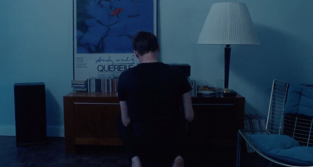 Arthur丢下基友接Jacques电话去了,镜头跟着基友的视角落到了床边的书堆上,旁边就是《男孩遇见女孩》的大型海报。