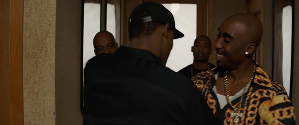 我想绝大部分影迷观影为的就是第二条线,但遗憾地是这段的比例并没有特别去高光渲染,大部分歌也仅仅沦为30S的背景音乐。通俗说,不过瘾,你并不能感受到在说唱史最为著名的黄金年代,2Pac到底有多炸裂!
