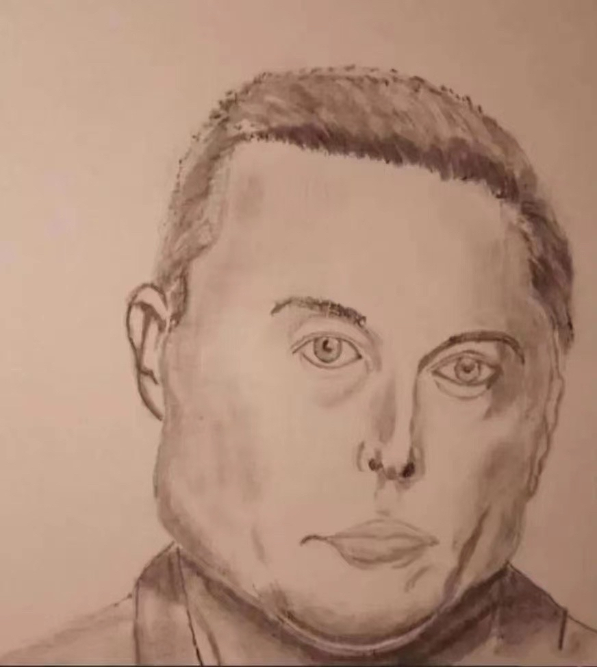 这是马斯克的崇拜者给马斯克画的像,这个人非常崇拜马斯克。但是,当马斯克本人在社交网站上看到这幅画时,要求他的粉丝立即把这幅画删除,并告诫这个人说且永远放下画笔。