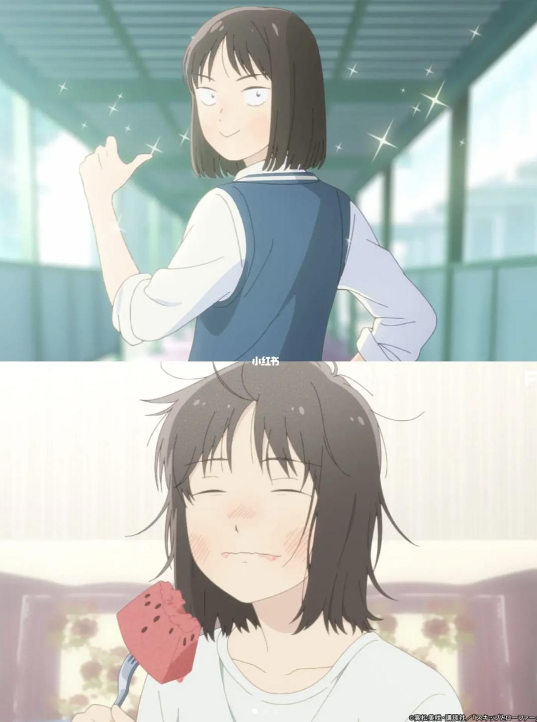 原作标题为《スキップとローファー》,直译应为“小跳步与乐福鞋”。スキップ(skip)并非平常的跳跃(jump),而是“小跳步”,是那种常见于背着双肩包的学生的蹦蹦跳跳。鲜有成年人还会有スキップ,啊,不对,古美门好像也会这么跳。而乐福鞋是一种休闲鞋,是日本女中学生常见的款式。我个人非常喜欢这种意象组合的起名方式,包括但不限于本作、《蜂蜜与四叶草》、《天真与闪电》、《狼与香辛料》……若是更宽泛一点地说《镜与灯》、《菊与刀》也是同类型的起名方式。这种方式不需使用动词就能调动读者的能动性,就能让观众主动地从意象进行联想,并且主动去构建意象间的关联和互动,还能纳入很多文化意涵,是很有诗意和美感的起名方式。以本作为例,“小跳步与乐福鞋”,刻画出的是一个蹦蹦跳跳、天真烂漫的元气女中学生。OP的动画也很有心地给了一个美津未跳着小步的鞋的特写——那就是具象化的スキップとローファー。