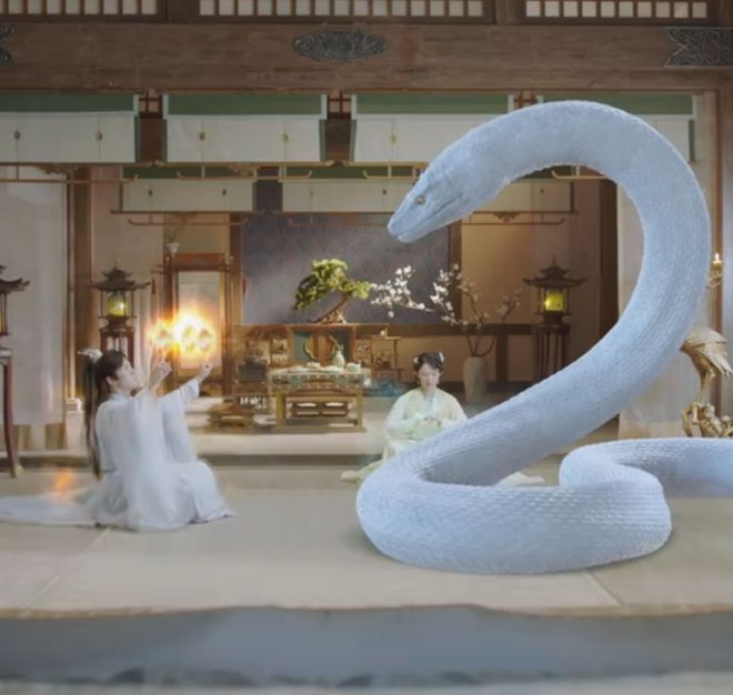 林妍柔饰演的女主雪玲珑,本是青城山下的蛇妖,苦修千年渡过雷劫,褪蛇身为美少女。