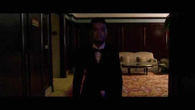 在导演需要的时候,比如下面这段佩恩要潜伏进森严的高级黑帮所在的酒店,导演就开始玩心大起,镜头忽然改成了一种“身后人”视角运动着,让观众感到自己尾随着佩恩在执行潜伏任务,佩恩在拐角撞上花衬衣男子时,看的人都忍不住跟着屏住呼吸。