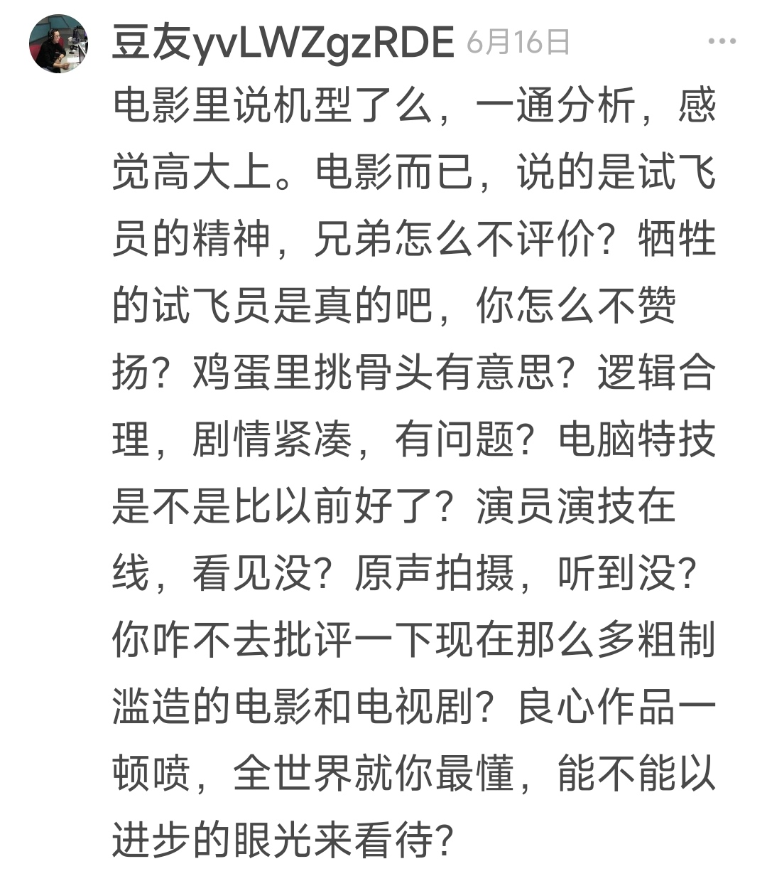 6.“观众看不懂/不在乎”,世界上不是只有一种观众,你个人也没法代表所有观众。有些观众,他们可能是军迷,航空迷,相关从业者,关心我国国防建设的人,我相信这些人不在少数,他们看的懂,他们在乎,但是他们没粉丝那么大的声音,没人能听见他们的要求。这些潜在观众本可以去贡献更高的票房的。