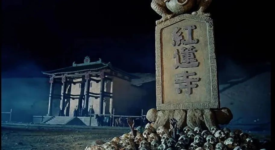 后面又出现了打斗场景,放在90年代应该算是平均水平,但现在回头看就比较惊艳了,血滴子一出场,马头人头落地,血溅沙场。少林寺众人被抓进红莲寺,红莲寺门口就有一个骷髅堆起来的碑,还插了一些断手,红莲寺进门后,佛像狰狞,四处透着血腥。