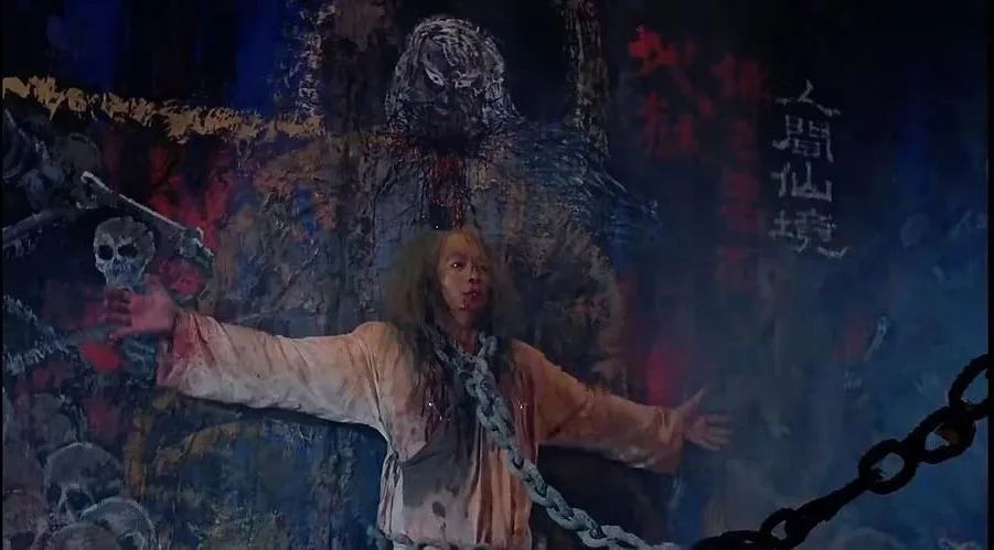 本片最出彩最惊艳的人物,当数黄锦江扮演的神公。此公不但神功无敌,而且残暴无常,不高兴时随手取掉身边伺女的头颅,时常大笔挥绘画鬼图,嚣张写就“佛已乐在地狱”大字,两段狂言更是让人入耳难忘: