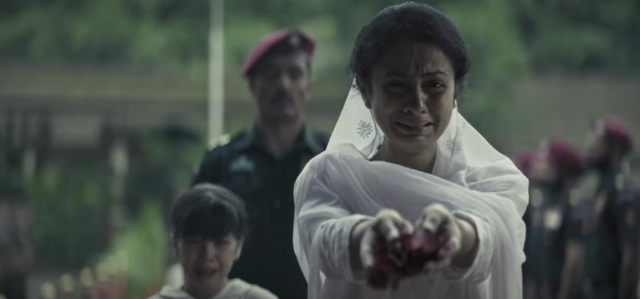 在为殉难士兵举行的国葬上,气氛庄严肃穆,但失去父亲的女儿、失去丈夫的妻子,无法抑制悲伤,悲痛的哭声,撕裂了现场的寂静,也打碎了在场每一个人的心。