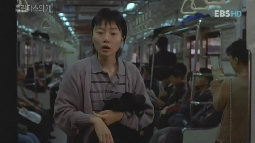 n 最后还是没有下去手,把小狗放在柜子里藏起来。离开的时候他还微笑了一下,嗯,解决了一个心头石。n 走出地下室后,院子里很热闹。片头正式开始,背景音乐进,很有生活气息显得很随意的配乐。这是一部很有现实意义的电影。片中的出现角色都是社会中普通的人物,甚至是社会底层的。n 在地铁站,女主角裴斗娜登场。在地铁上迷迷糊糊的睡着了,醒来后看到背着孩子乞讨人还傻乎乎的给人让座。n