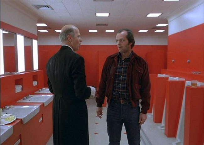 于是我们的任务就如预期般地出现了.为了解决这些疑点,我们只能先打乱影片的结构.首先我们要证实的是杰克眼中的宴会幽灵的真实性.导演没有在这点上同我们周旋太久,妻子温迪在影片中诚实地向我们证明了宴会幽灵绝对不是真实存在的.它们只存在于杰克的想象中.于是下一个问题紧接而来.既然宴会幽灵完全是虚幻的,那么当杰克被关押时,为他开门的是谁呢?我们不可能单纯地回答自己是"幽灵"开的门.这样毫无意义,原因仍旧是:这是库布里克的电影.于是,我们用最简单的推理得出的答案是:儿子丹尼放出了杰克.