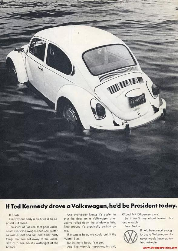 1972年,由Doyle Dane Bernbach创造的大众汽车广告经典仿冒品发表,海报声称甲壳虫的密封性非常好,可以在水面漂浮。底下的Headline写道“如果泰德·肯尼迪(Ted Kennedy)驾驶大众汽车(Volkswagen),他今天就能当上总统了。”最后,为了逃避大众的3000万追责起诉,NL不得不“召回”该期杂志并发表道歉声明(Simmons同意到全国各地去旅行,把每一期杂志上有问题的那一页都撕掉,但那期杂志已经卖光了。已经没有人可以删除这个假广告了)。不过,哪怕是道歉,他们也一如既往的讽刺——“ Even if Ted Kennedy had driven a Volkswagen he wouldn’t be president today.”
