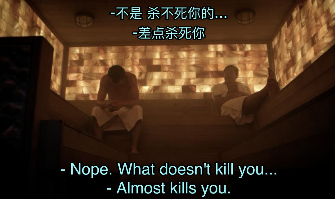 这句台词很有趣耶,原句是哲学家尼采的名言What doesn't kill you makes you stronger(但凡杀不死你的都会使你更加强大)这句台词对其进行了幽默性的解构:What doesn't kill you almost kills you.(那些没杀死你的差点把你杀了????) 瞎说什么大实话呢(bushi)