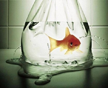 一只黑色金鱼在玻璃缸里来回游着,有种稚嫩的忧伤。