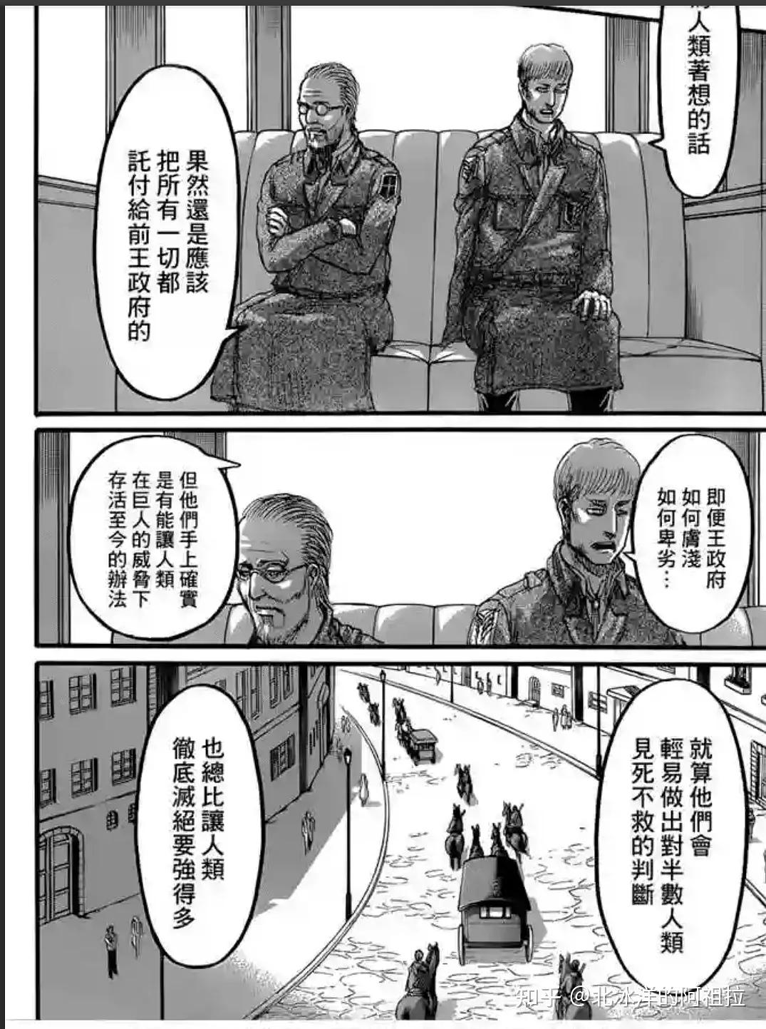 墙内不断牺牲无辜者去供养战争,墙外的艾尔迪亚人卑微如蝼蚁夹缝求生,整个世界靠燃烧艾尔迪亚人的脂膏发出光芒。nn艾伦·耶格尔深陷与兄弟吉克(绝育计划)及调查兵团新领导层(扶持可控继承者)不可调和的矛盾之中,艾伦就这样从执行者被迫蜕变为孤独的棋手,甚至最终成为了棋盘本身。n匆匆裹挟到其中的耶格尔,所信奉的正义就这样仓促的垮掉了。