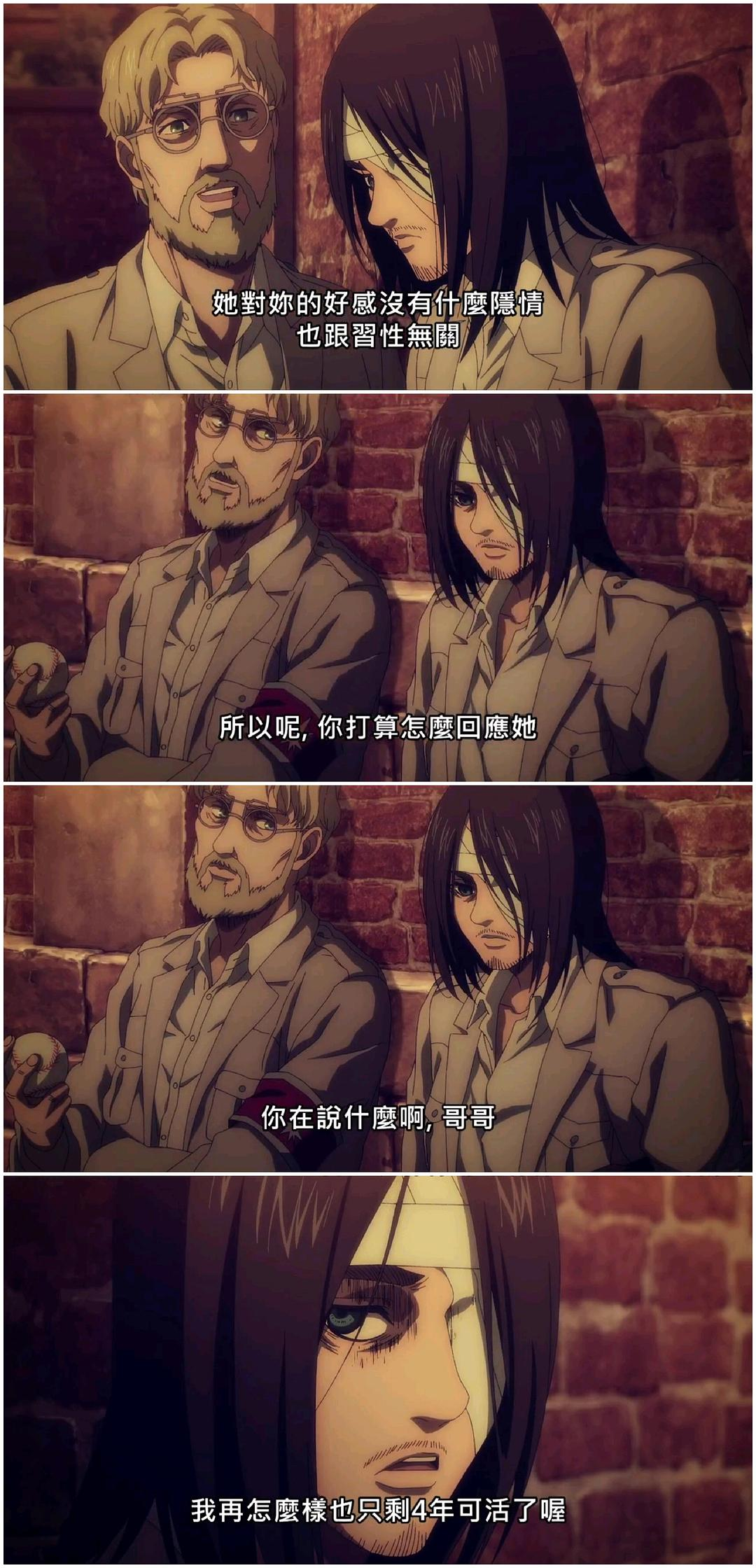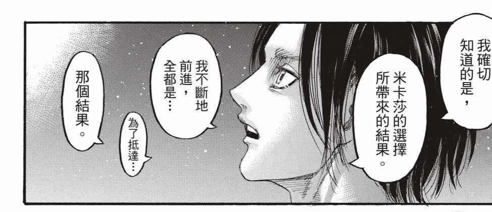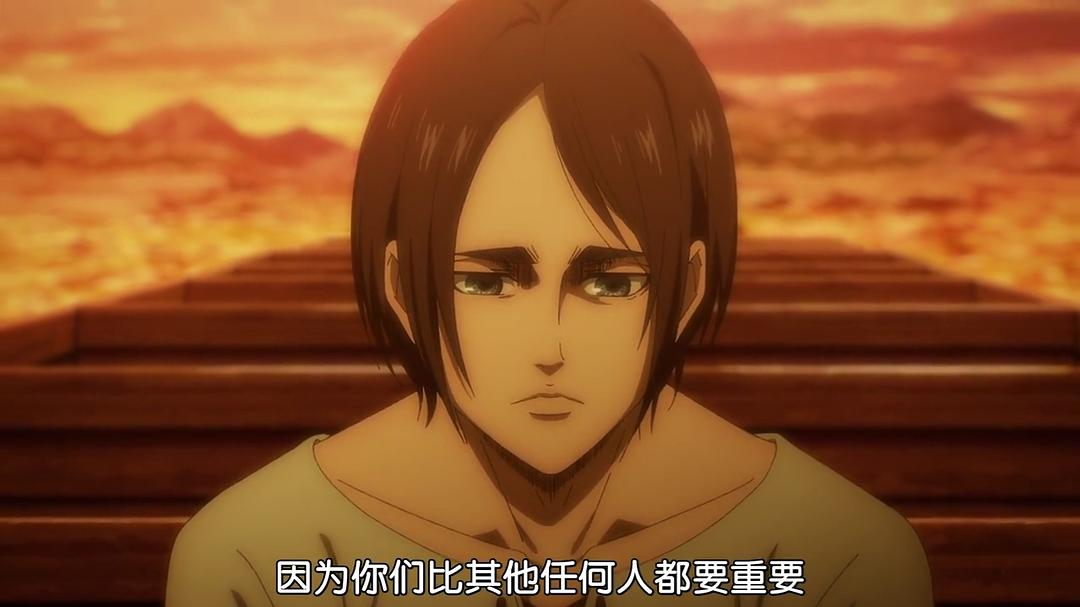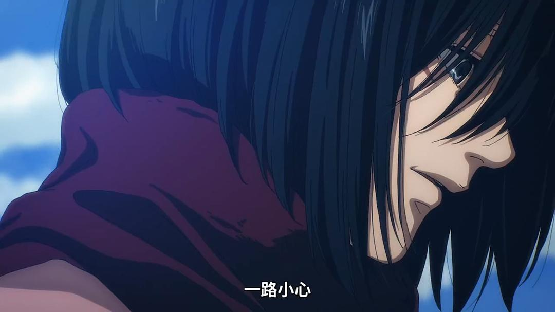 艾伦和三笠的感情线一直有种虚假的圆满,二者从没有过正常情侣一样的耳鬓厮磨,更像是在8+全龄向动画里扮演伙伴,反反复复训练、战斗,讽刺的是,只有当艾伦变成巨人的时候,才是艾伦最能做自己的时候,那时候少有的两者真情流露。