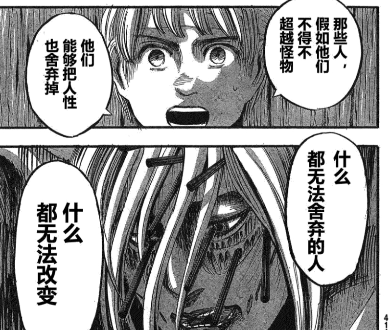 至于表达的怎样嘛,我是觉得调查兵团精神传达的最高峰已经永久停留在了玛利亚之墙夺回战,艾伦的愤怒倒是131话表现的还不错,只是结局“我也不知道为什么要这样做”实在让人没什么可说的……我也不清楚谏山创为什么在最后一话连哪怕口头点一下主题这种事都懒得做。”