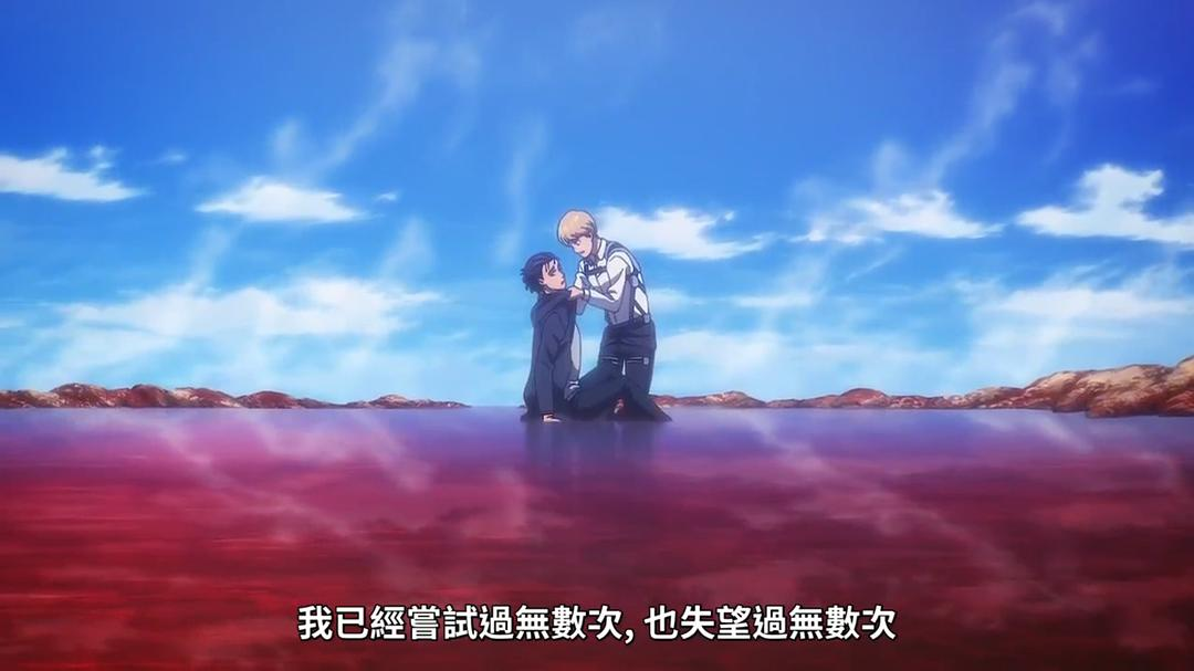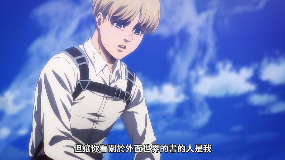 我觉得动画中对于漫画而言最好的就是添加了艾伦与阿尔敏的对话。这段对话可以使得艾伦与观众的距离感更近了,能更好地理解艾伦,这段也证明了我上文所对艾伦的人物分析是正确的(我觉得是吧……)。