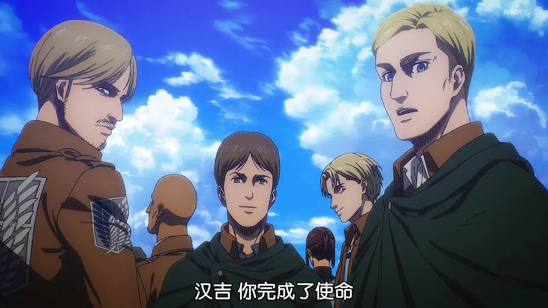 埃尔文塑造的分量无需我多言。其他角色的缺陷基本不是类似艾伦就是类似阿尔敏,像希斯特利亚贾碧这类角色就是艾伦那种“前后塑造方针不统一”的情况;莱纳、教官则是近似于阿尔敏“早早用尽角色潜力,高潮无法发挥”的情况。还有一类是无功无过型的。大家可以自行甄别。