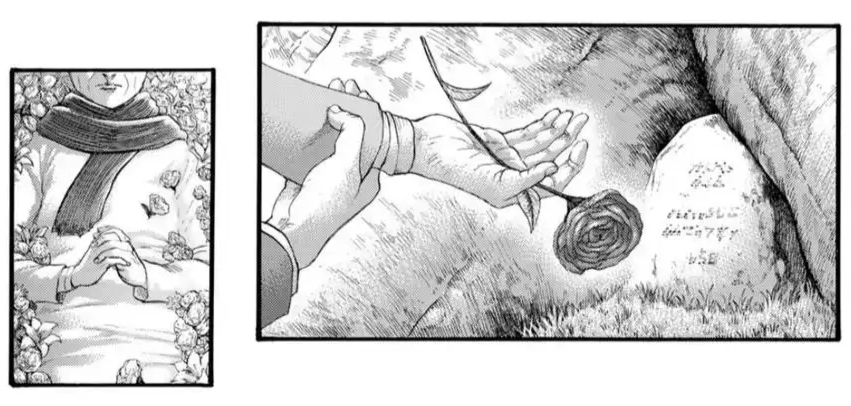 其实谏山创给了几个暗示三笠没有结婚了。在谏山创故事中是有几个花语的画面。而在这里艾伦的墓前有四朵玫瑰,四朵玫瑰表示:恋人之间的海誓山盟。下一页老年的三笠献了一朵玫瑰给艾伦,代表着彼此都是自身的唯一。而三笠的手上的绷带依旧在三笠没有解开,没有把印记传达下去,也就说明三笠没有生孩子。关于围巾表面含义也不需要我多说了,但关于围巾对于艾伦和三笠之间的关系我后面说。