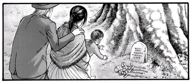 很多人看三笠旁边的人的背影觉得三笠是和让结婚了,其实我更相信这个人是阿尔敏,而三笠抱着的应该是阿尔敏的孩子。因为139话的标题是:朝着山丘上的那棵树。那棵树是艾伦、三笠、阿尔敏三人小时候赛跑的终点,加页也属于139话,那么最后三人依旧在这棵树下,也应该合情合理吧。