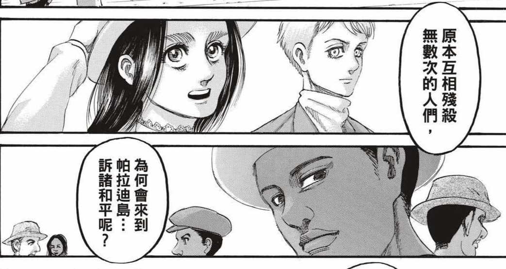 当然这就是谏山创抛出的一个重要问题:人们是否能完全抛弃仇恨。正因艾尔迪亚人曾经凭借巨人之力对世界进行了暴力的统治,才产生了世界对艾尔迪亚人的仇恨。而艾尔迪亚人已经没有进行这类行为,只剩下作出这类行径的人的后辈时,世界依旧将仇恨延续下去直到艾尔迪亚人身上。就如同莎夏救的女孩所说:妈妈她没有做任何事却被巨人吃掉了啊。而对于那些没有做过像曾经的前辈那样过错的人,难道就应该被仇恨吗?历史是要铭记,但是不要把仇恨延续给后代,这样才能避免像贾碧这样的人出现。