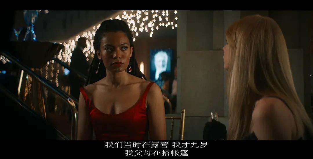 接下来在第三集,这集贡献了女生们在慈善晚会喝酒排排坐的本剧最温馨场面(目前为止),也是这个场景让观众对凯特好感大增。这一集我们见到了各个角色的家长,通过对家庭的描写,再一次丰富了主角团人物形象,这是群像剧的基本功之一。但是注意,这一集晚会上的部分,导演真正想表达的主题应该是围绕着父母与孩子间的谎言与真相。比如女主莫罗进入晚会就给自己编了个父母仍在世的假身份,像她这样不善言辞的人在说到关于父母的谎话时却格外娴熟,不过在最后她向众人表示自己的父母是编的,她说出了真相,这就点题了。安德烈的父亲在会上承认了自己知道“森林”存在的事实,这说明之前他在撒谎而现在说出了真相。乔丹李的父母在美化乔丹的少年经历,但他勇敢地回应了父母,向投资人说了实情,这也对应了谎言与真相。艾玛的母亲为艾玛的表演而向投资人撒谎,而艾玛在一番谎言后说出了真相,这同样是对谎言与真相的呼应。那么主角团里除了父母已逝不得不说谎的莫罗,还有谁在说谎呢?答案是凯特。凯特不是top10,但她借喝酒的名义来到会场,实际可能是为了监视安德森。在会上,凯特为了平复与乔丹李争吵的莫罗,主动向她说起了自己的父母,这一段家庭故事凯特讲得极为流畅,声情并茂,让人不禁心生怜悯。
