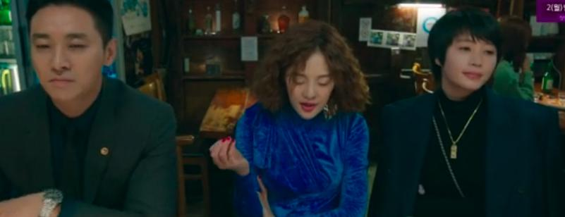 至于郑金子,本身就是污泥里打滚,光脚不怕穿鞋,一心想挣大钱,只是客户品流复杂,有打架的混混,也有财力雄厚人品恶劣的财阀们,她信奉“法律不等于正义,它是一种非常不完善的机制”,所以可以不顾平民的嚎哭给他们伸张正义,只是言明取得最大利益做对自己最有利的事情才是上策“因为,法律不是站在你这边”,当然在财阀们聚会里载歌载舞自罚一杯这种显得更有种混不吝的气质,看过金惠秀《中国城》《美玉》的也很清楚,她身上那种江湖气、带点被社会捶打的老练世故,让她和正义热血的小白女主们划开距离,还有歌舞水准还是蛮不错的。