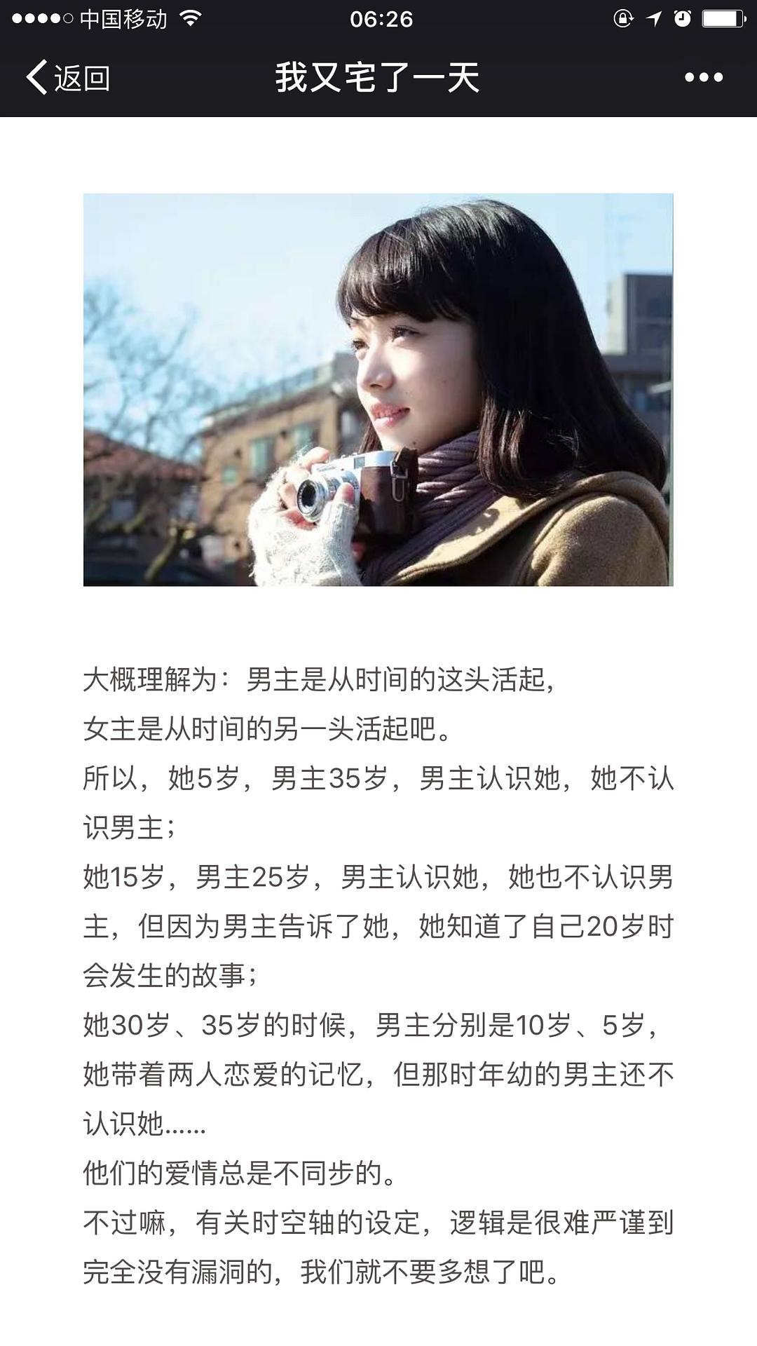 3.一个很重要的点,为什么20岁的女主角能知道35岁的女主角时发生的事,这是因为25岁的男主角告诉了女主。所以在剧中女主角的表现是,既知道过去,又知道未来。