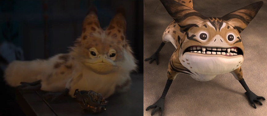 这些是本剧原创种族——诺蒂人(Noti)。埃兹拉和莎宾似乎很容易结识龟形物种。在《义军崛起》里,他们的切宝基地附近就生活着龟形动物多克蚂(Dokma)。