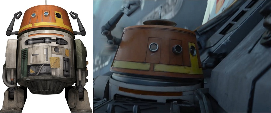 IW-37钢钳装卸机器人(IW-37 pincer loader droid)出自《西斯复仇》,由赛博星际(Cybot Galactica)在克隆人战争期间为共和国生产,被用来处理敏感易爆的军用物资。nHV-7装卸机器人(HV-7 loading droid)出自2009年的桌面RPG设定书《传承时代战役指南》(Legacy Era Campaign Guide),本剧将其名字引入了正史。在书里,它们是一种小型悬浮多功能机器人,利用反重力技术搬运重物,还能折叠成圆盘,减少占地空间。