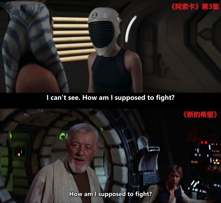 本集的莎宾和《新的希望》里的卢克在第一次接受剑术盲练时,都说了一样的话:“I can't see. How am I supposed to fight?”