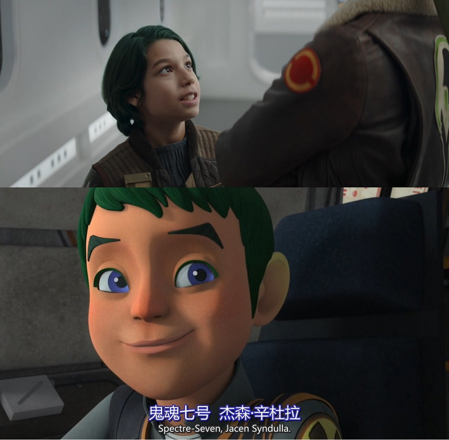 在《义军崛起》里,埃兹拉用原力跳到半空中,再由凯南用原力把他推到对面的目的地,是师徒俩经常配合完成的特技。在本集,“原力觉醒”的莎宾发挥了凯南的作用。