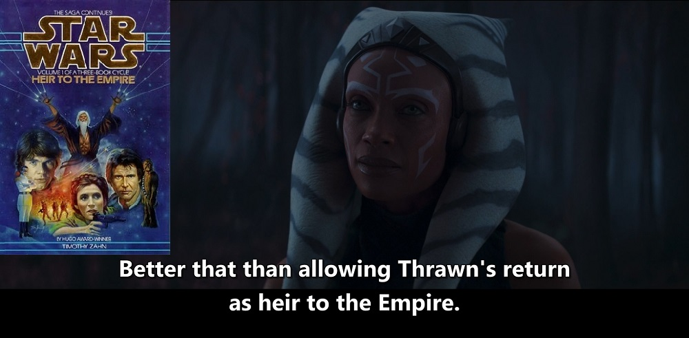 其实,在2019年出版的正史小说《索龙:结盟》(Thrawn: Alliances)第15章,在克隆人战争末期,索龙见过帕德梅与阿纳金。帕德梅向索龙提到阿纳金的前徒弟,同时也提到阿索卡,但没有明说阿索卡就是阿纳金的前徒弟。所以直到本集,索龙都没联想到阿索卡就是阿纳金的前学徒。