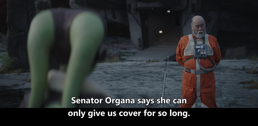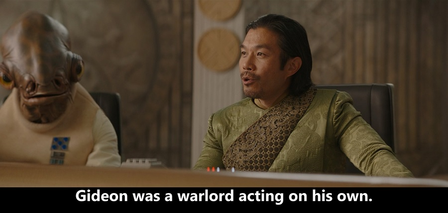 卡森·泰瓦队长与翔野滨户议员提到行星曼达洛的冲突与军阀吉迪恩,确认本剧的时间线在《曼达洛人》第三季之后。另外,坐在翔野议员右手边的就是新共和国国防舰队上将贾尔·阿克巴(Gial Ackbar),由埃尔登·本内特(Elden Bennett)饰演。