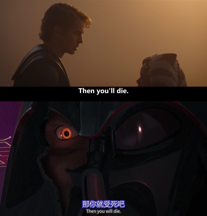 在疑似赖洛思的战场,阿纳金对阿索卡说:“Then you'll die.”在《义军崛起》第二季最后一集,变成维德的阿纳金在与阿索卡决斗时,说过同样的话。