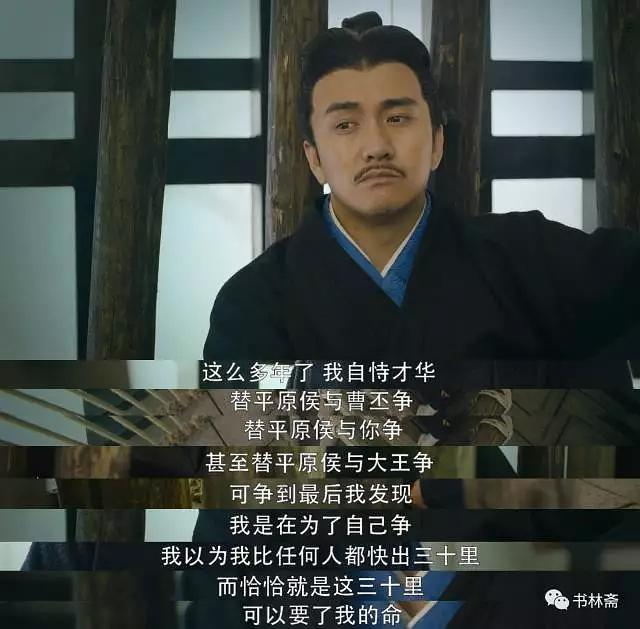 比如杨修,作为司马懿前期的主要对手之一,杨修充当的是反派角色。一般来说反派角色往往是容易出彩的,诸如《大明王朝1566》里的严世藩,但是在本剧中杨修却表现得颇为令人反感。这样一个世家公子,极为聪明,全剧中论及脑袋灵光怕是没有人及得上他,而他恃才傲物偏又沾染政局,心中没有道德约束,只有强肉弱食,最终被曹操所杀。在临死前他对司马懿说:「这么多年了,我自恃才华,替平原侯与曹丕争,替平原侯与你争,甚至替平原侯与大王争,可争到最后我发现,我是在为了自己争,我以为我比任何人都快出三十里,而恰恰就是这三十里,可以要了我的命。」