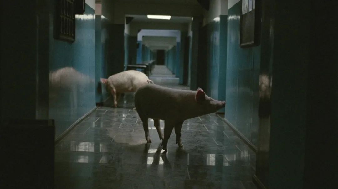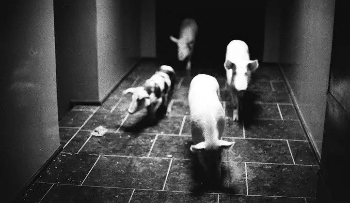 光头青年们大概是觉得不过瘾,随后就去猪圈拎起一头猪来羞辱,我们看到猪被他们蒙住了头,身上被写下“shame”等字,又被驱赶到餐厅里,大声地发出叫声,听得出是受到了极大的惊吓。其中一个青年突然操起斧子向猪身上剁去,把还在挣扎的猪头生生地砍了下来。餐厅的女伴失身痛哭起来,其余的众人也在惊诧中沉默着,看着青年们又把猪腿撕扯了下来。