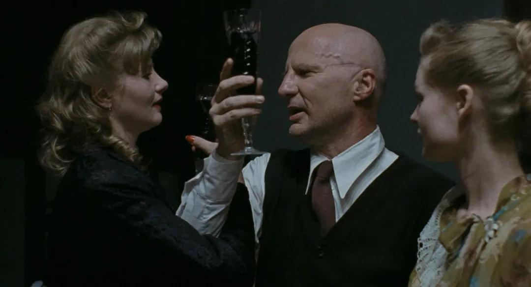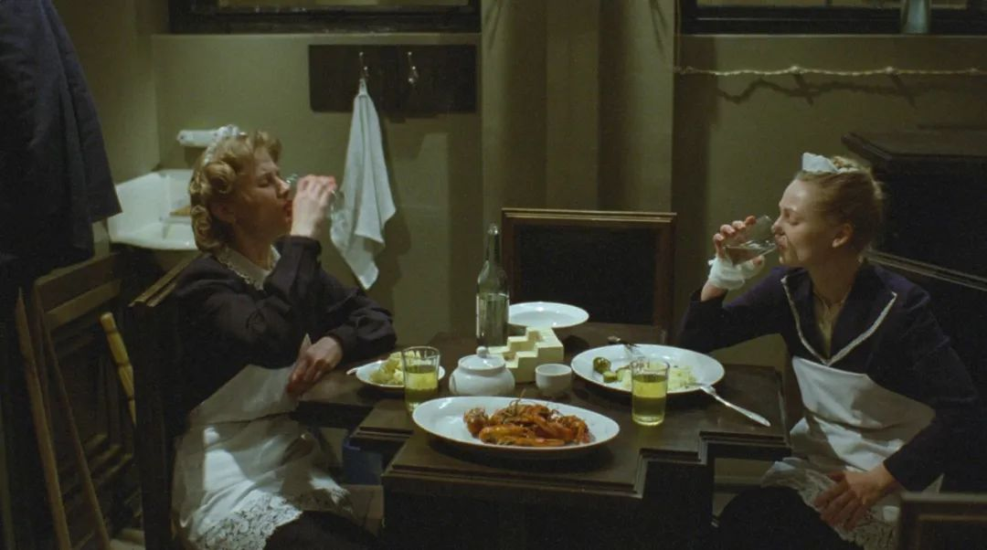 但这个过程又不是我们想象的纯粹的残酷折磨,Vladimir似乎熟稔“打一巴掌给一颗糖”的审讯策略,给Natasha斟酒,命令其吃沙拉,又反复提起要和Natasha做朋友。Natasha的反应也很让人玩味,她在被凌辱后,还能收拾衣装正襟危坐,并施展她作为女人的魅力,试图取得Vladimir的好感。