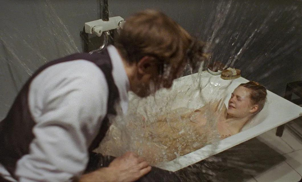 突然镜头一转,Olga躺在浴缸里被KGB(苏联国家安全委员会)的人泼水醒酒,Natasha随后被带到审讯室,拷问关于她与外国科学家luc的关系,一步一步被KGB的头子Vladimir进行生理与心理的折磨——剥去衣衫,披头散发,用方才喝过的白兰地酒瓶凌辱侵犯。