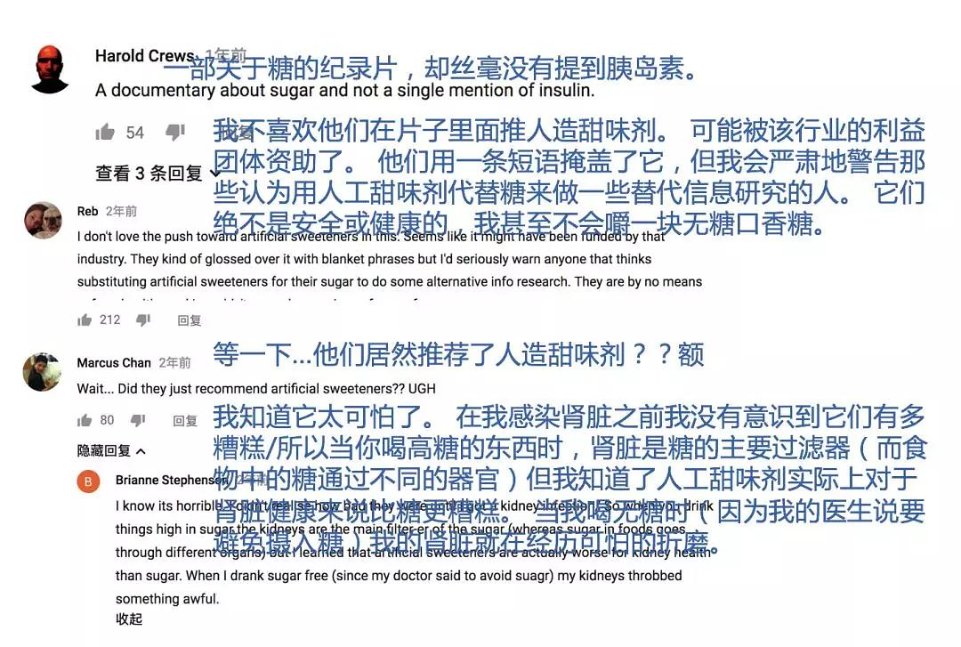 然后我又去油管搜了一下,看看歪果仁怎么说,结果令人惊讶地发现大反转。排列最前面的两个blogger细节性地点评了这个纪录片的谬误,比如片中不断强调“碳水化合物让你发胖、让你生病”,但其实让你发胖的是“卡路里”,片中纯粹让碳水化合物背锅实在不合理,不符合逻辑。就像《食物的真相》那样只用单一角度标准去评价食物的优劣,简直以偏概全。