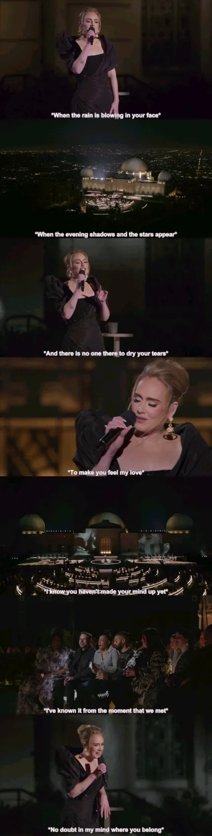 ADELE的演唱会喜欢选在黄昏,记得2016年在Glastonbury音乐节的那一场,那个时候还是本科,一遍一遍的看,爱到不行。最喜欢的one and only,心中挚爱。每次想听时,都会打开这场的视频,慢慢听着。那次也是黄昏。《30》的ONE NIGHT ONLY也是黄昏,每首歌的演唱,天空的颜色都不同,在这样的落日余晖中,听世界上最美的音乐,简直像在天堂呀。有一天重温la la land,发现原来选址就在电影中的那个天文台室外呀,就在洛杉矶。one night only,此夜唯一,its true.唯一的夕阳,定格下唯一的音乐,唯一的Adele.